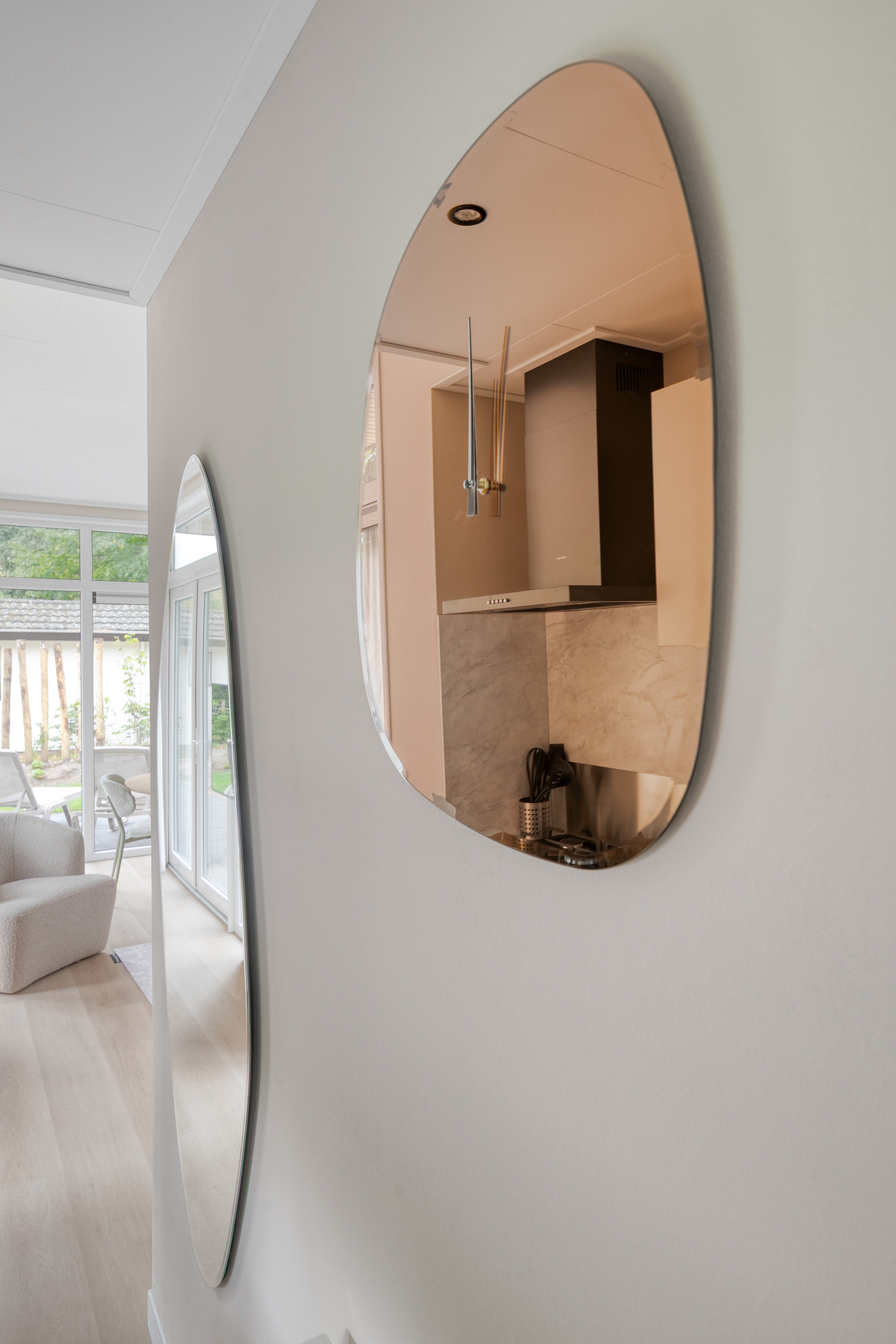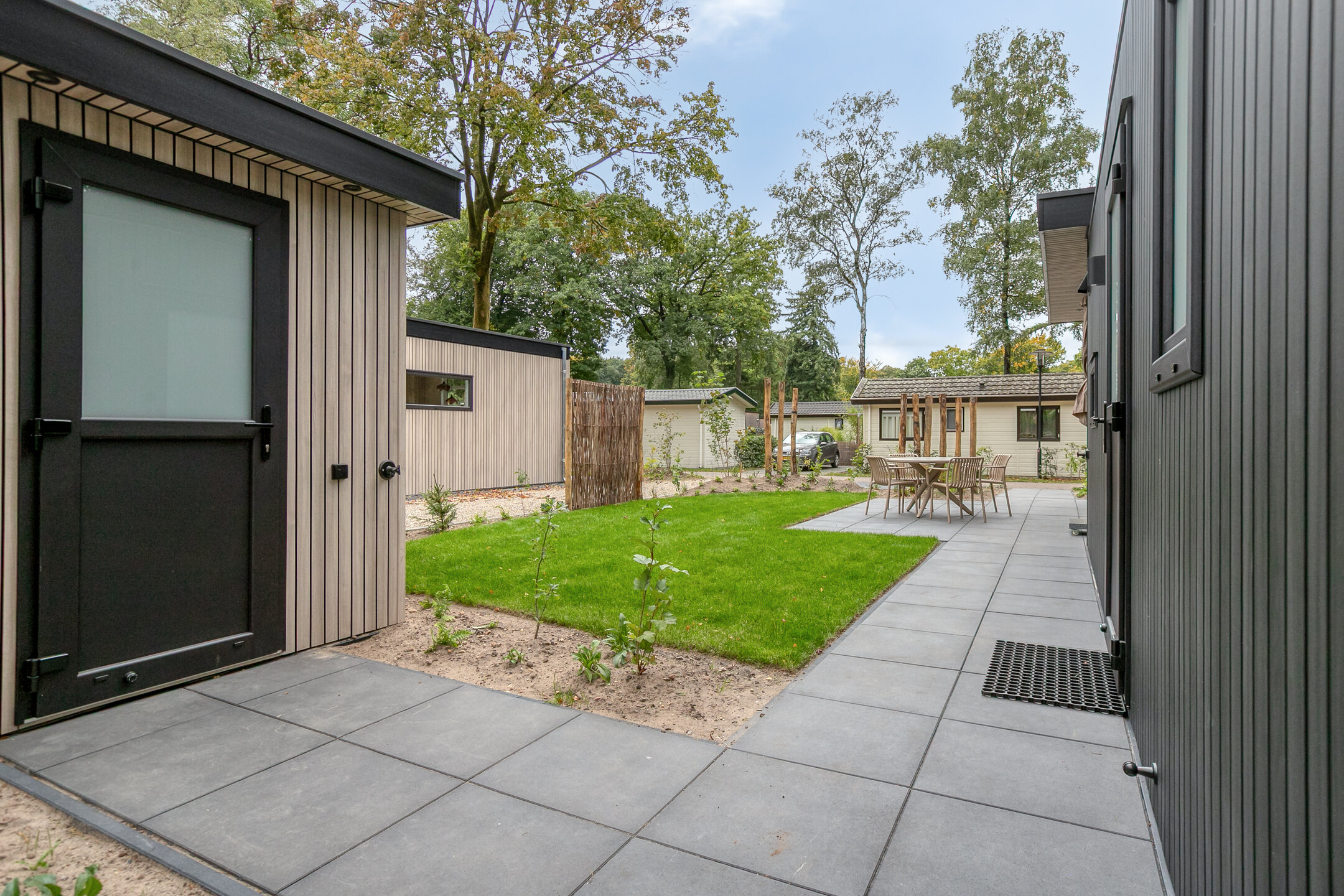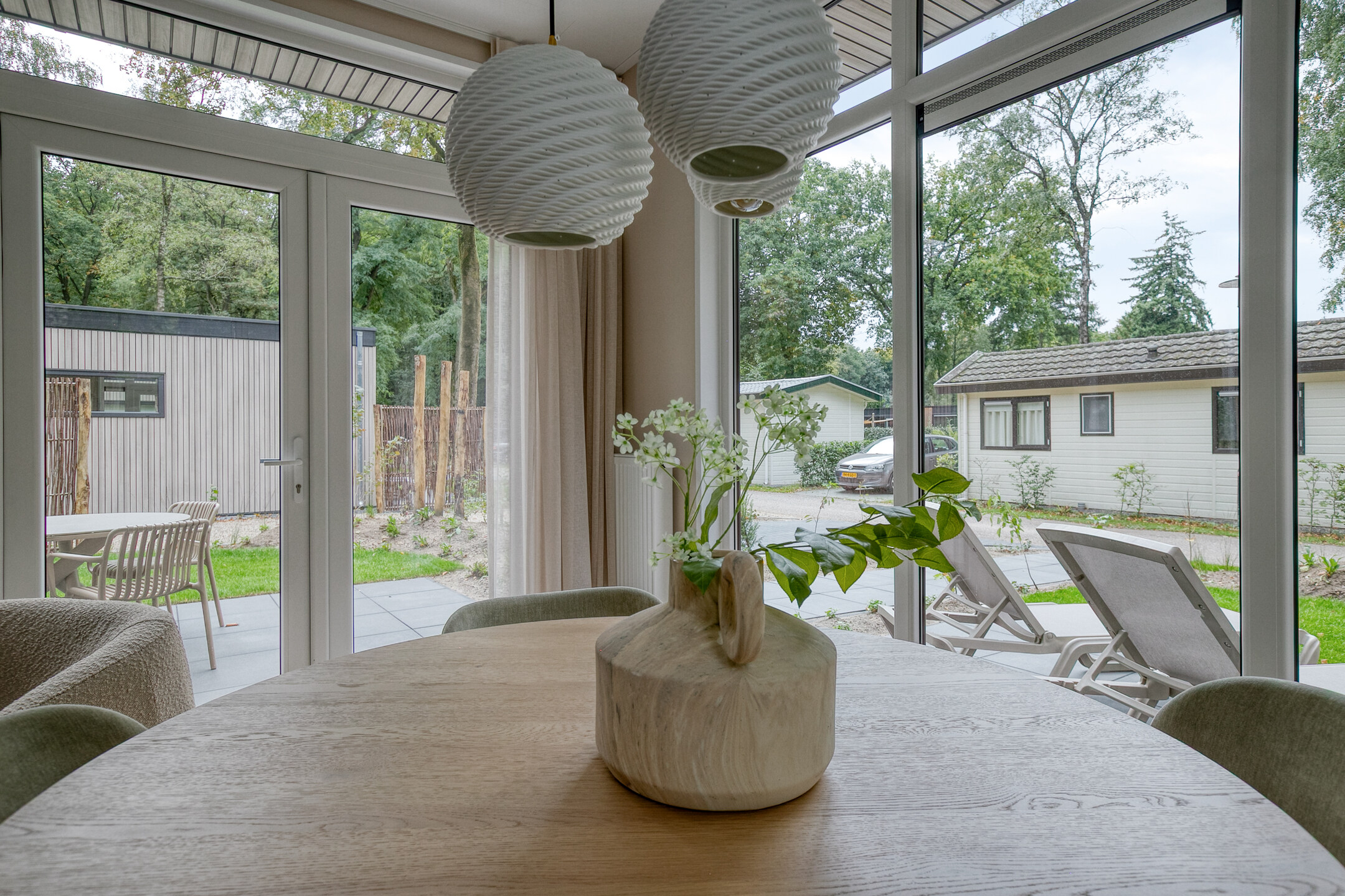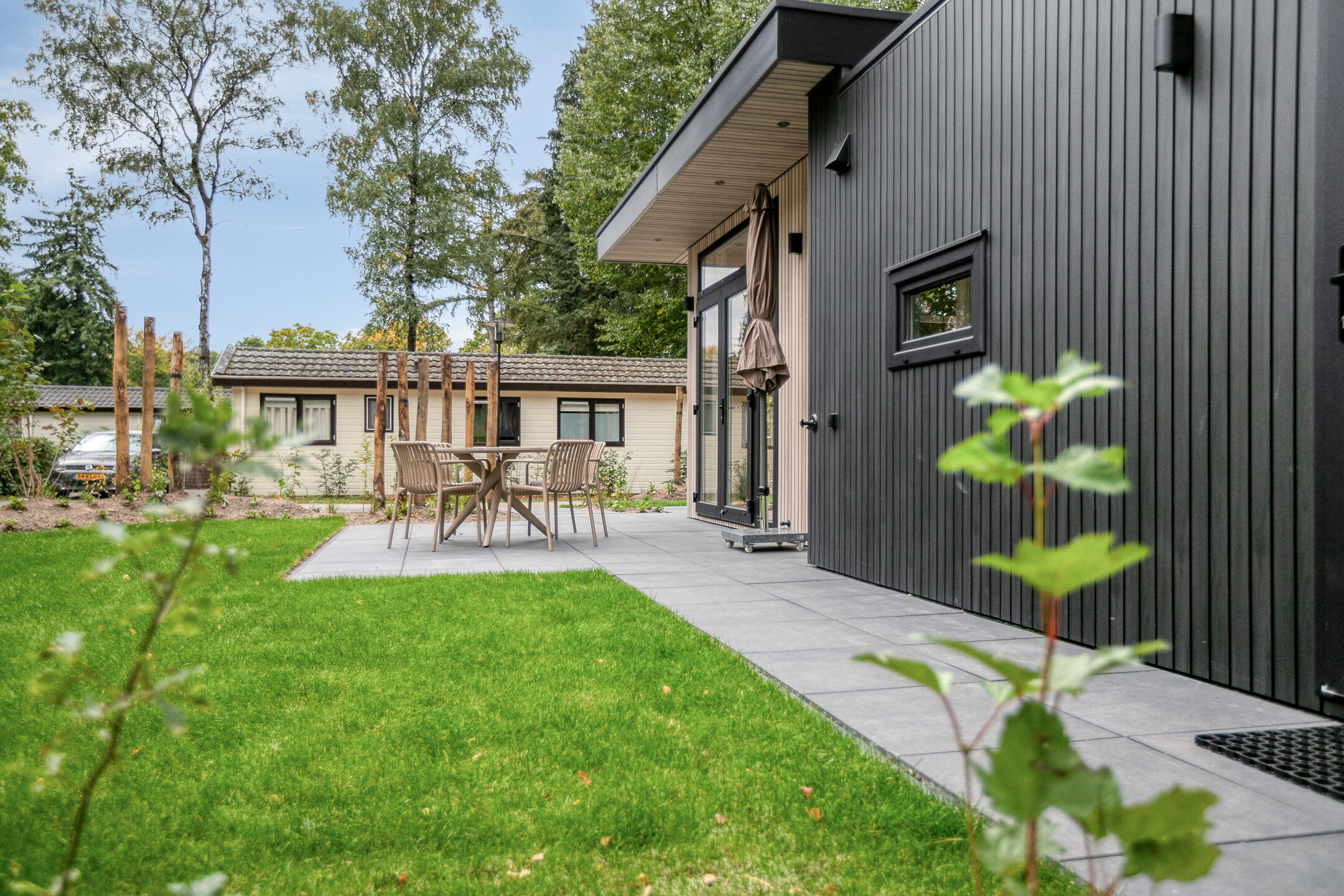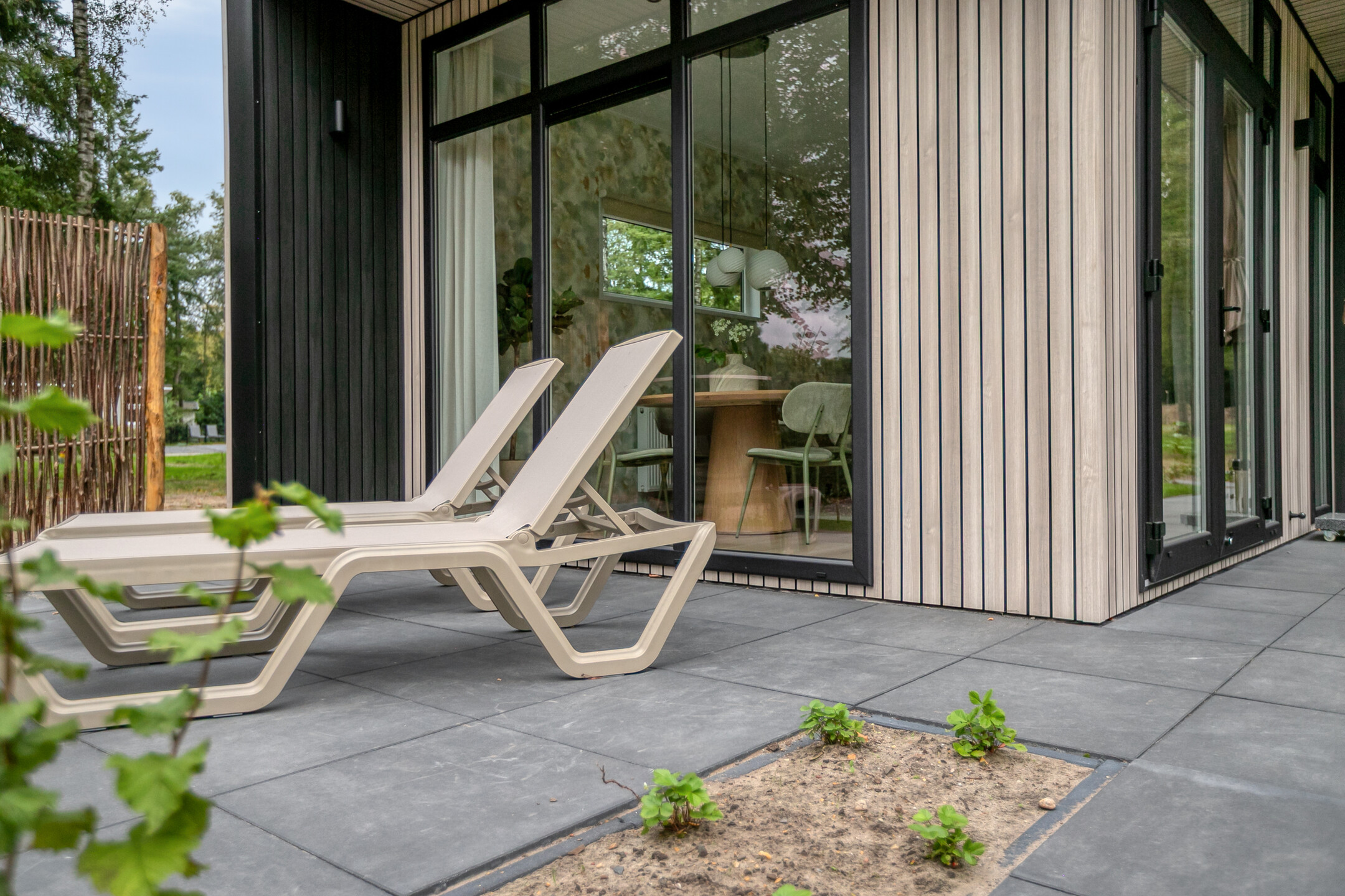 De openslaande deuren geven toegang tot het aangelegde terras en de tuin; ideaal om te ontspannen in uw eigen stukje natuur, optioneel met privé wellnessfaciliteiten.