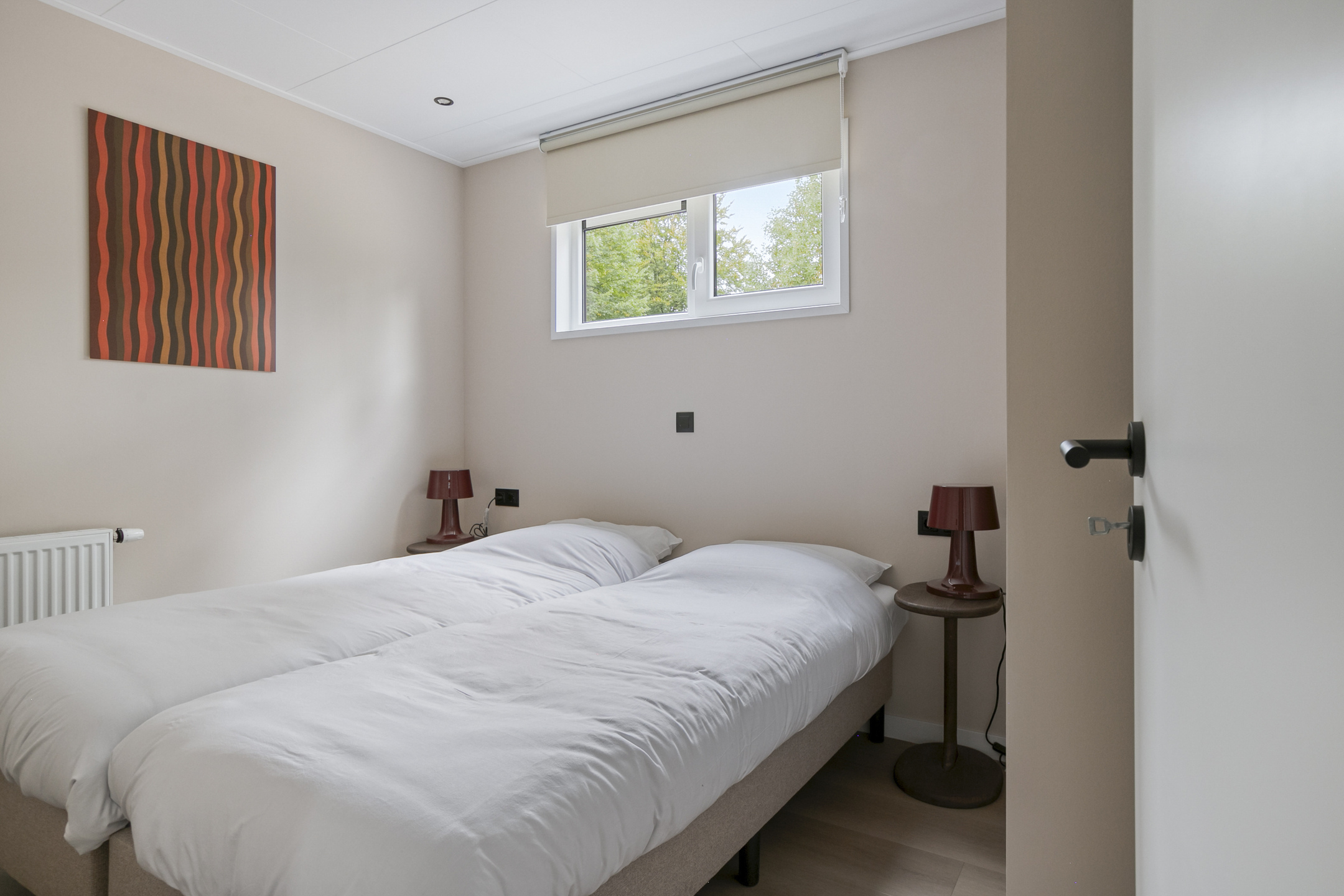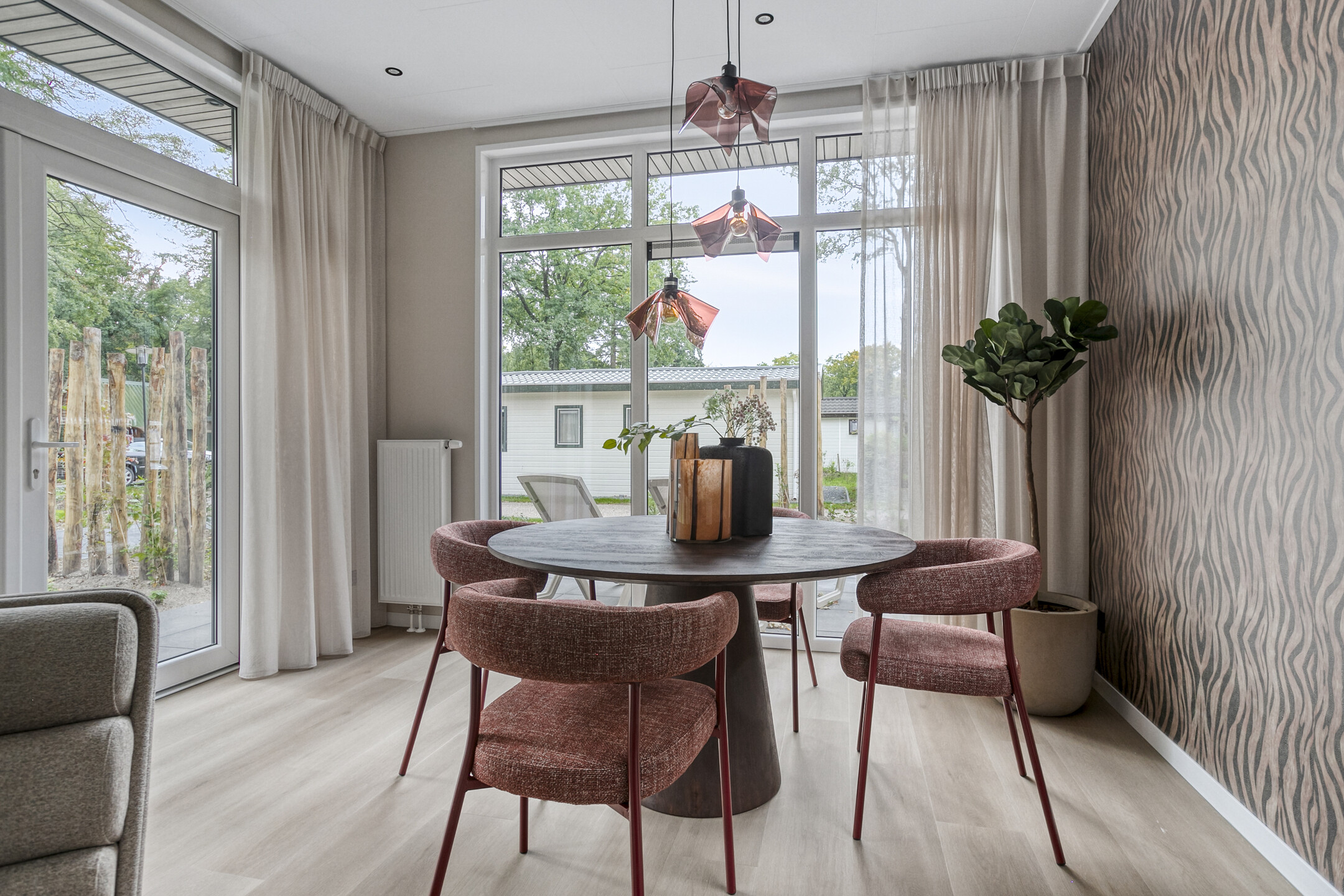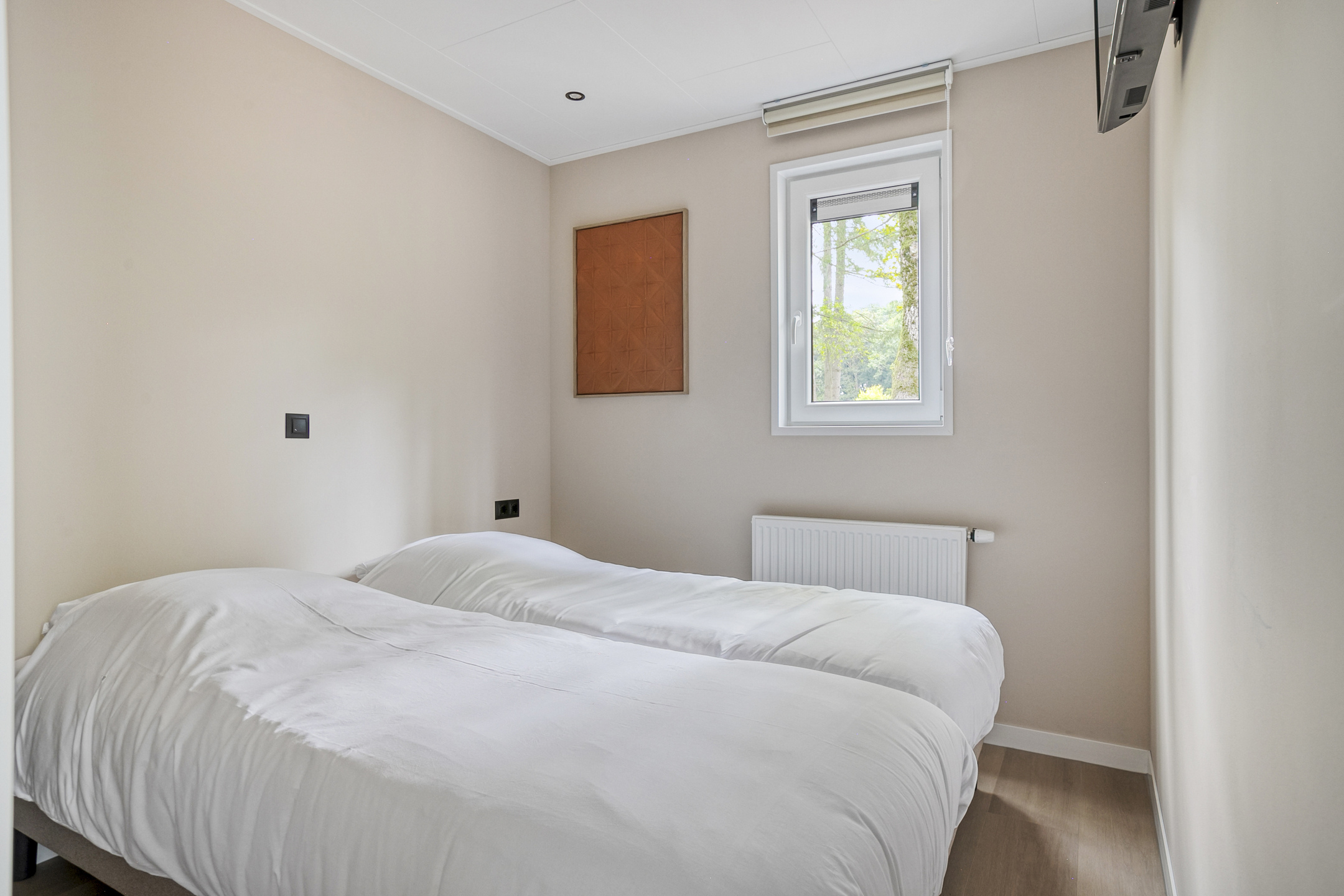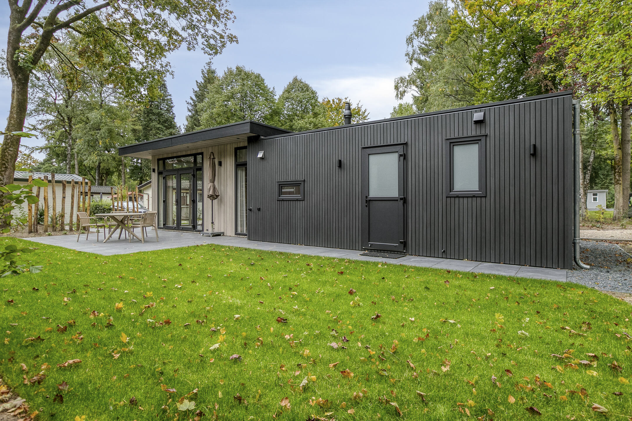 De openslaande deuren geven toegang tot het ruime terras en de natuurrijke tuin; de ideale plek om volledig tot rust te komen op uw eigen plekje op de Veluwe.