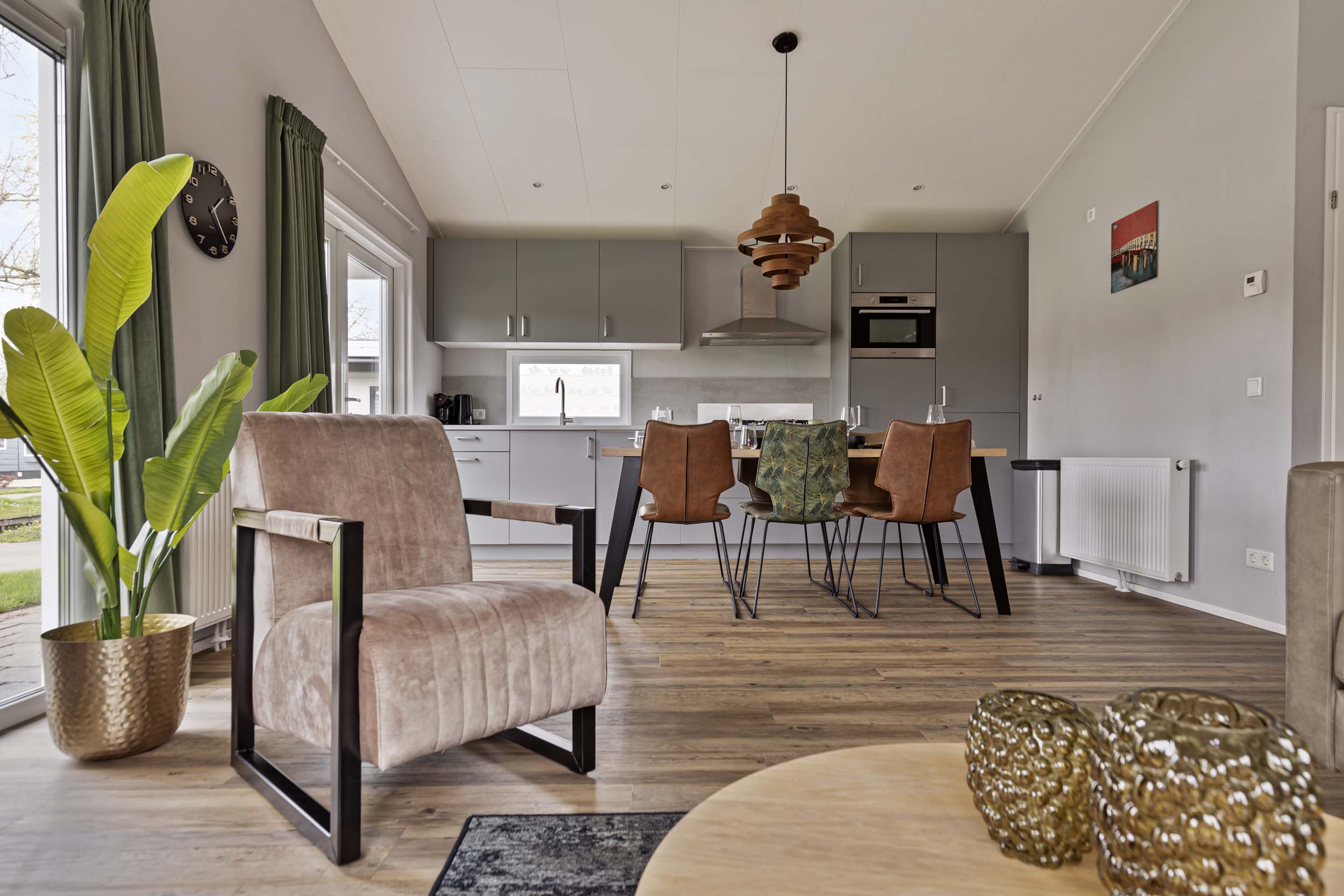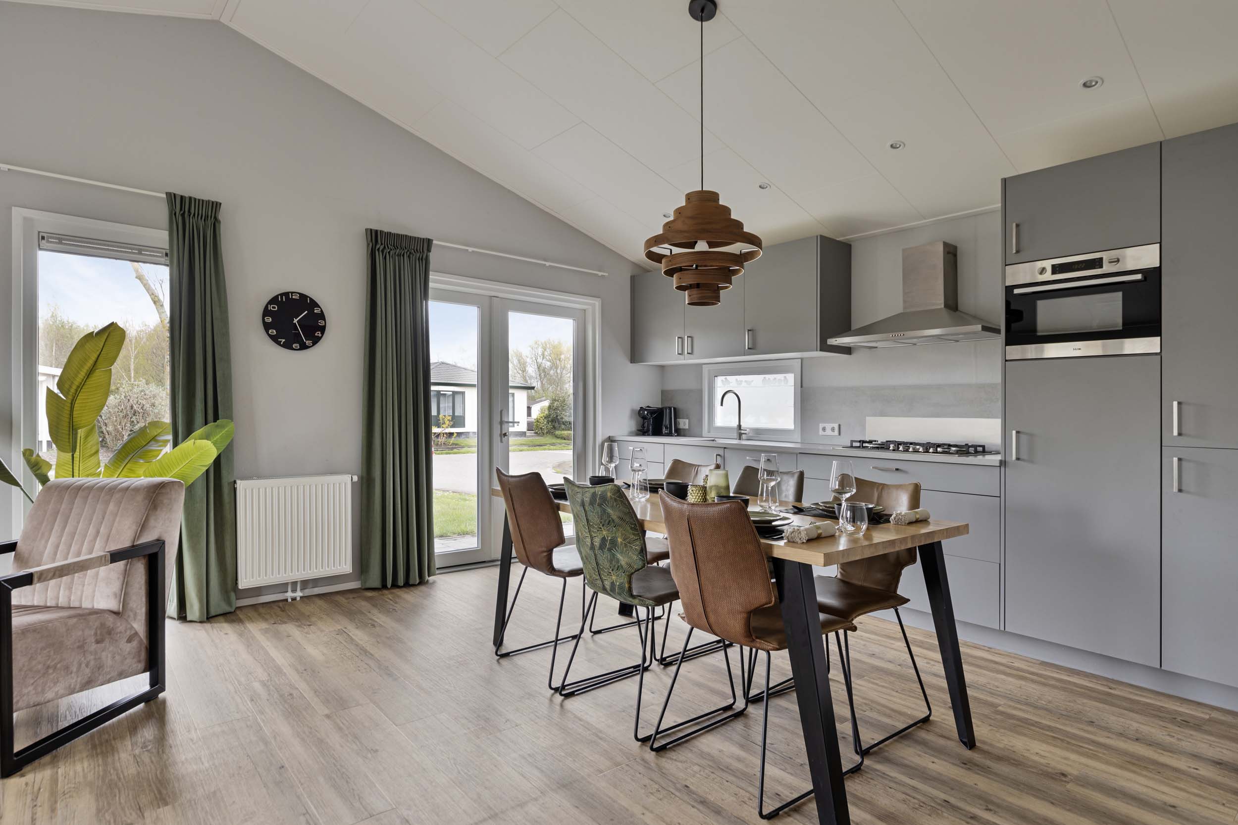 Binnen treft u een ruime woonkamer met grote ramen die veel natuurlijk licht binnenlaten en een prachtig uitzicht bieden. De woonkamer is ingericht met lichte, natuurlijke kleuren en beschikt over een gezellige eethoek en een open keuken, uitgerust met moderne inbouwapparatuur. Deze combinatie zorgt voor een warme, uitnodigende sfeer.