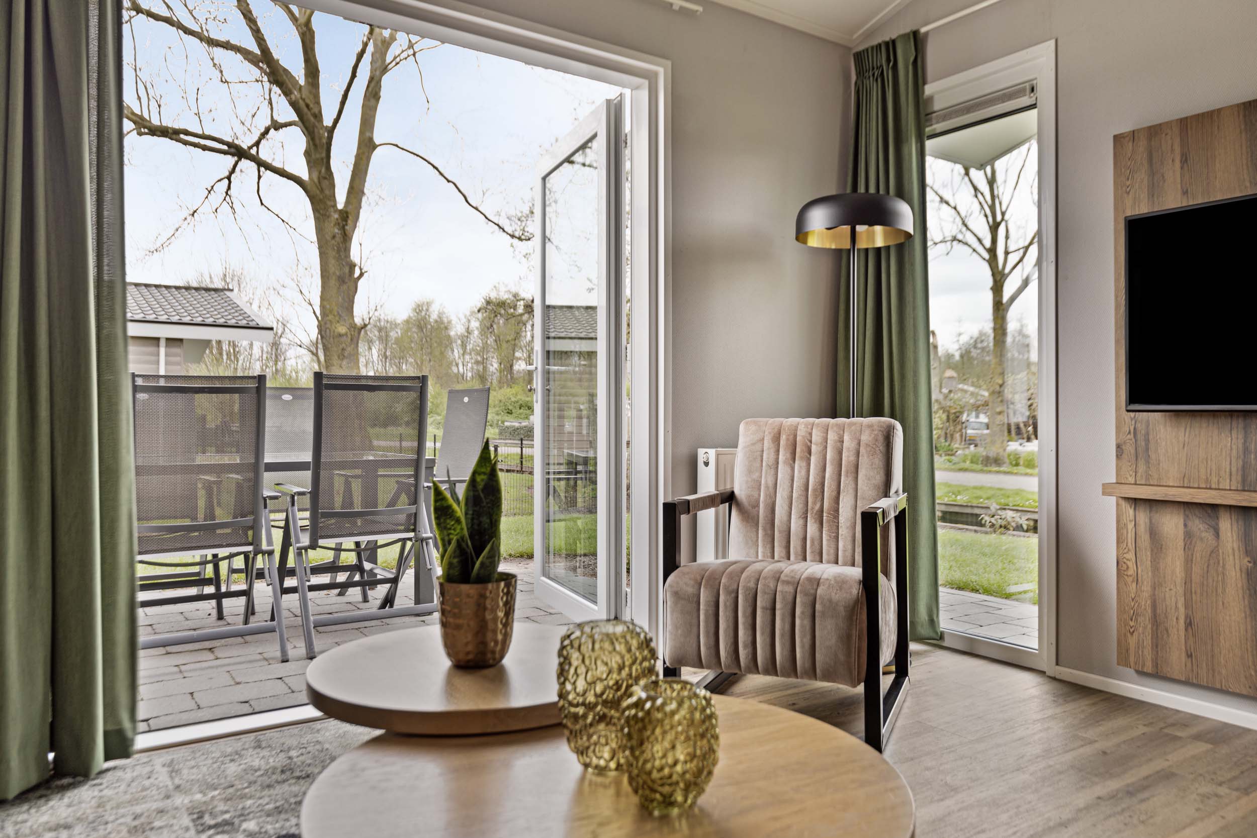 De openslaande deuren in de lichte woonkamer geven toegang tot de ruime tuin met een eigen terras, waar u optimaal kunt genieten van privacy en de omliggende natuur. De tuin biedt alle ruimte om te ontspannen, ongeacht het seizoen, met water en groen altijd binnen handbereik.