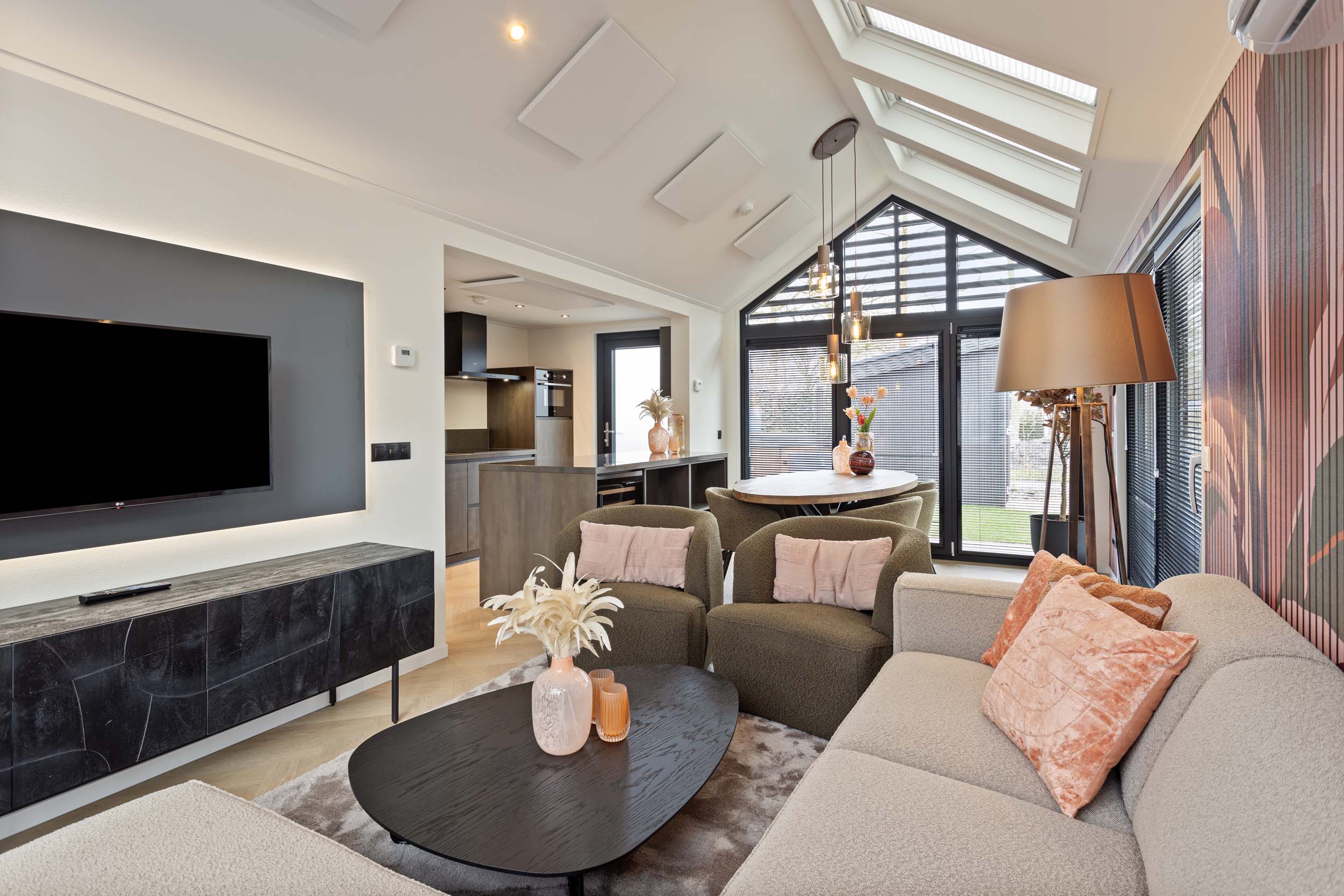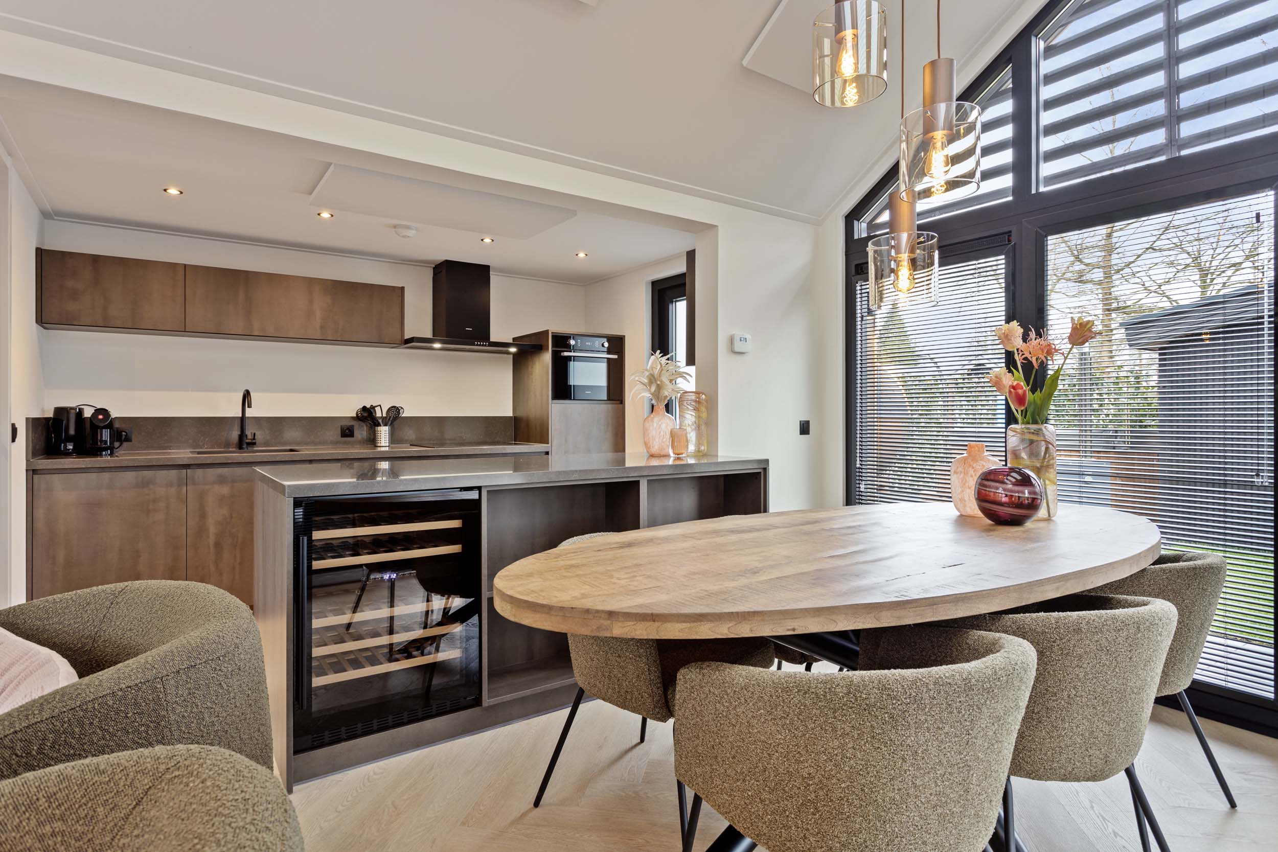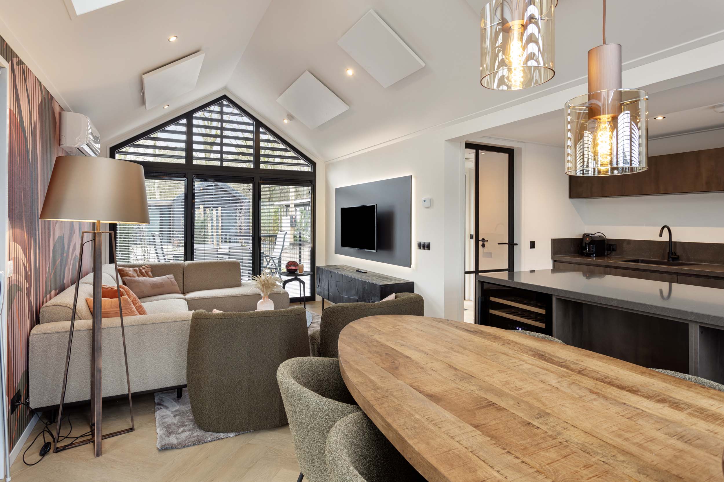 De Lodge Royal Eco beschikt over een sfeervolle woonkamer met hoge plafonds, waardoor de woning ruim aanvoelt. De inrichting (naar keuze) is modern en sfeervol met oog voor detail. Naast de woonkamer bevindt zich een eetgedeelte met open keuken, die van alle gemakken is voorzien.