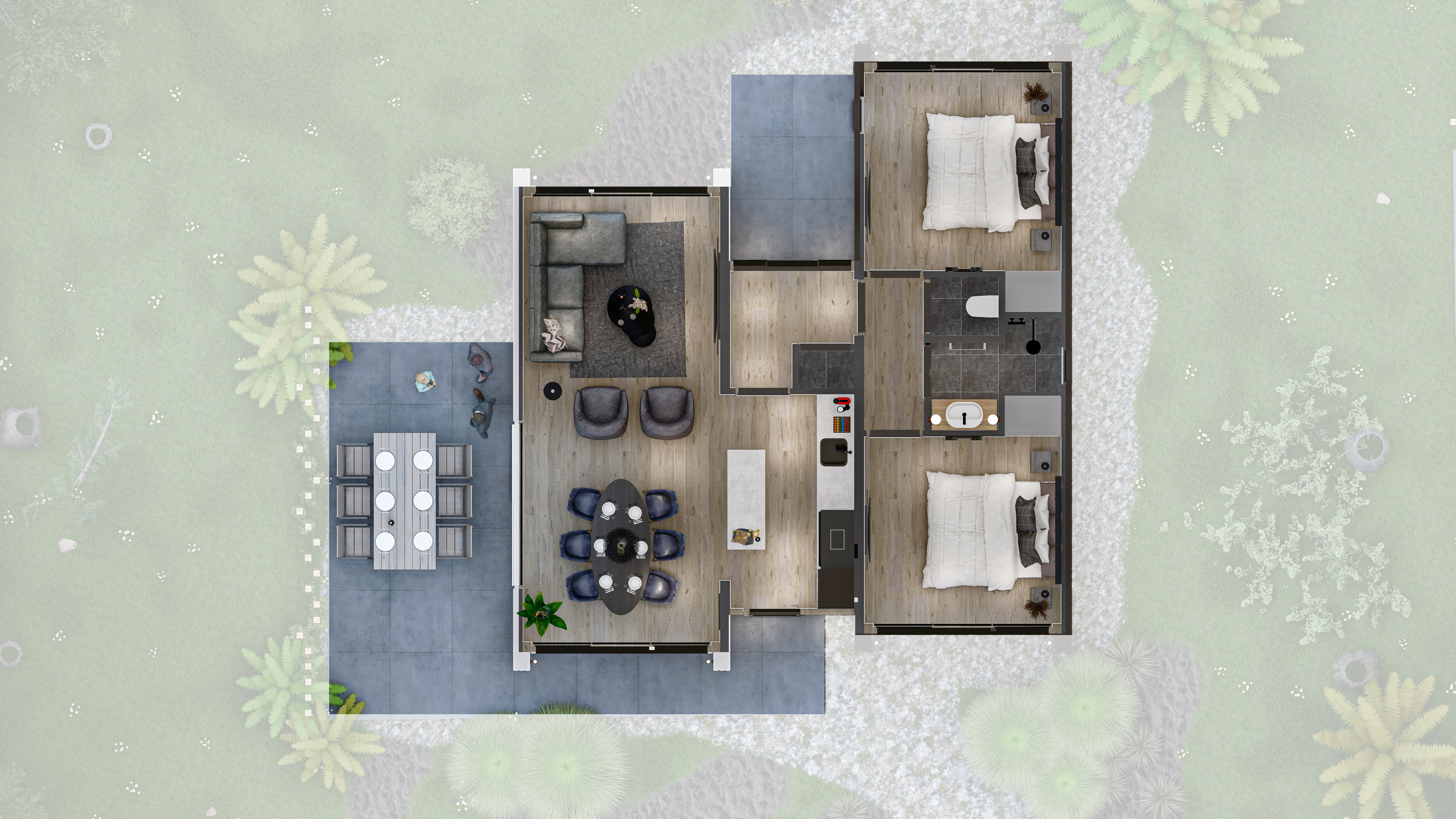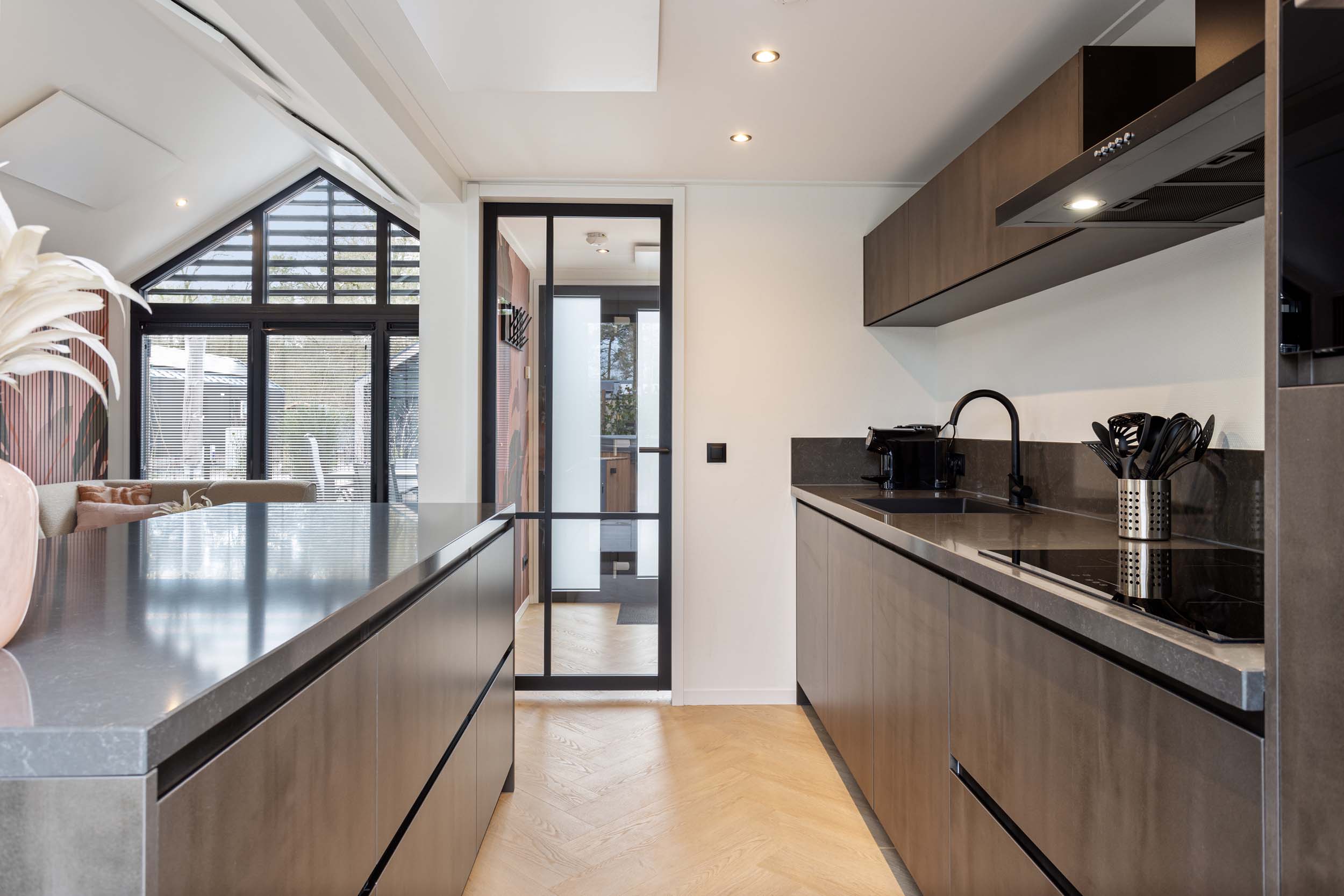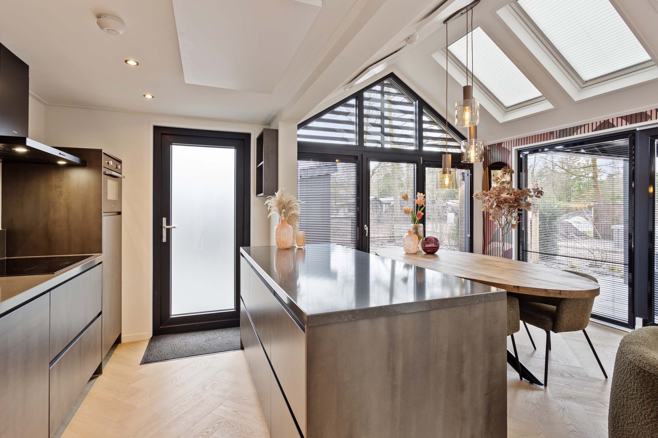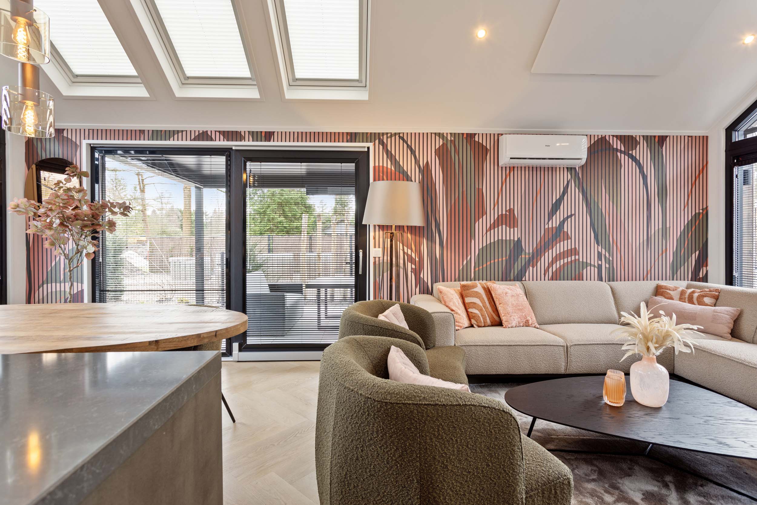 De Lodge Royal Eco beschikt over een sfeervolle woonkamer met hoge plafonds, waardoor de woning ruim aanvoelt. De inrichting (naar keuze) is modern en sfeervol met oog voor detail. Naast de woonkamer bevindt zich een eetgedeelte met open keuken, die van alle gemakken is voorzien.