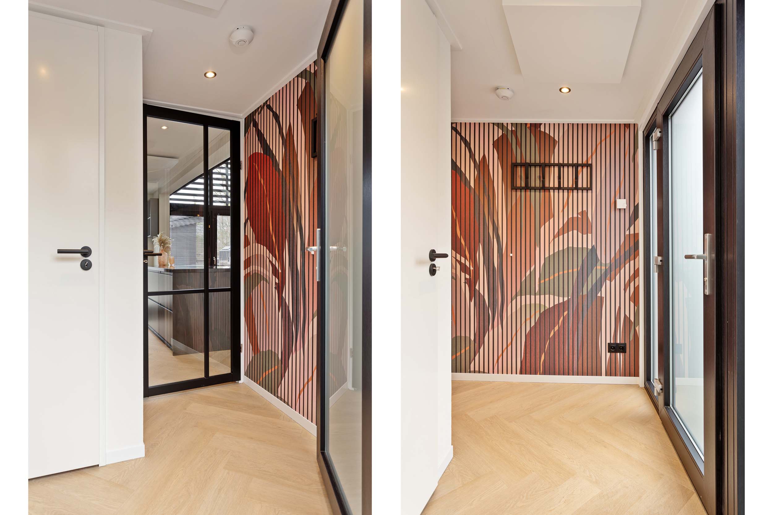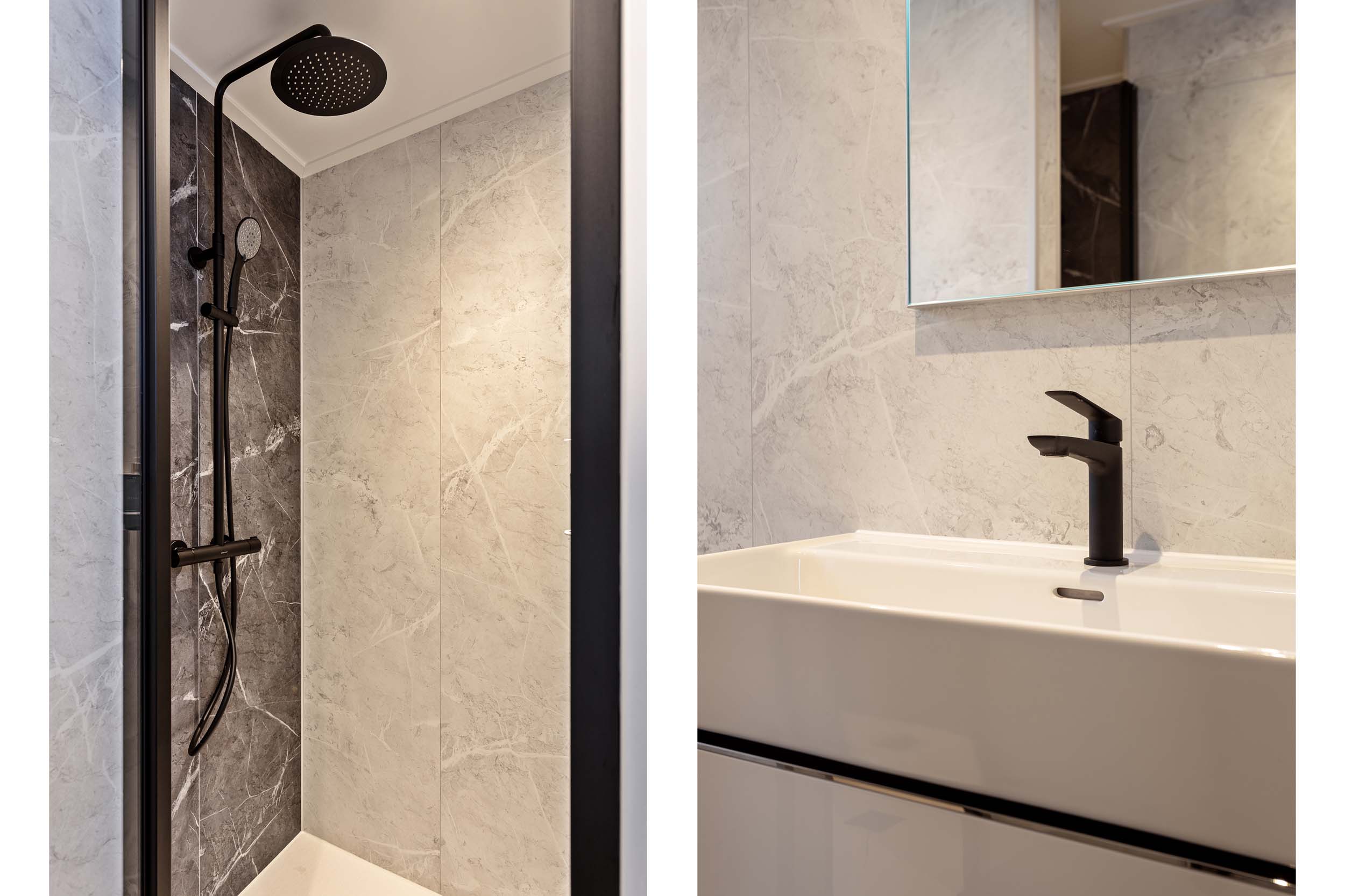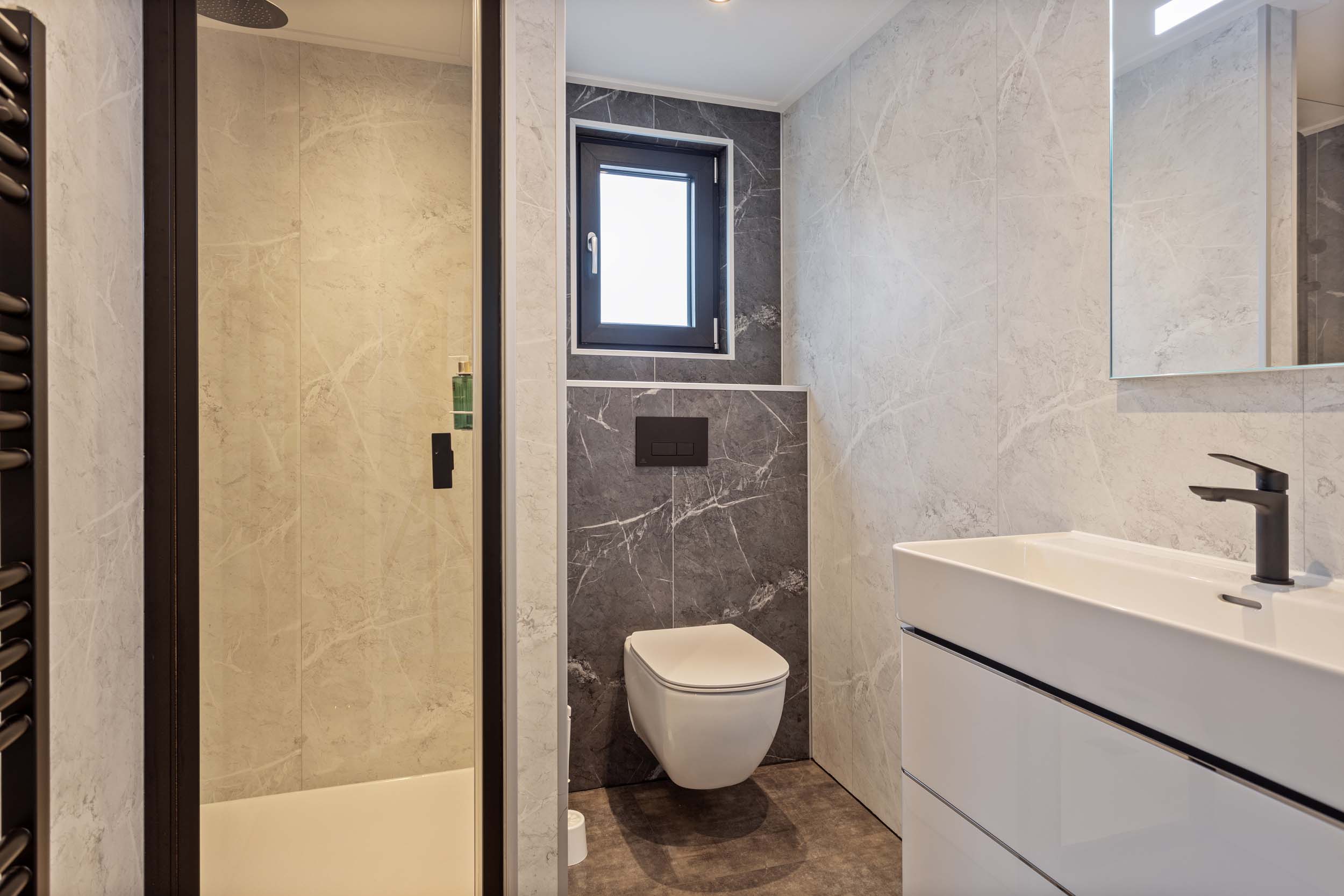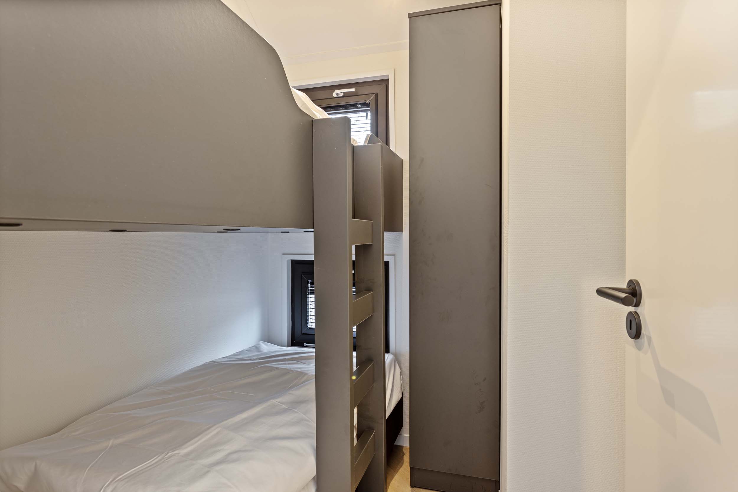 In de gang bevindt zich de badkamer met douche, toilet en wastafel. Aansluitend vindt u drie slaapkamers, waarvan twee slaapkamers met tweepersoons boxspring bedden en een slaapkamer met stapelbed. Deze vakantiewoning is ook beschikbaar als 4 persoons-uitvoering, waarbij het toilet zich in een aparte ruimte bevindt.