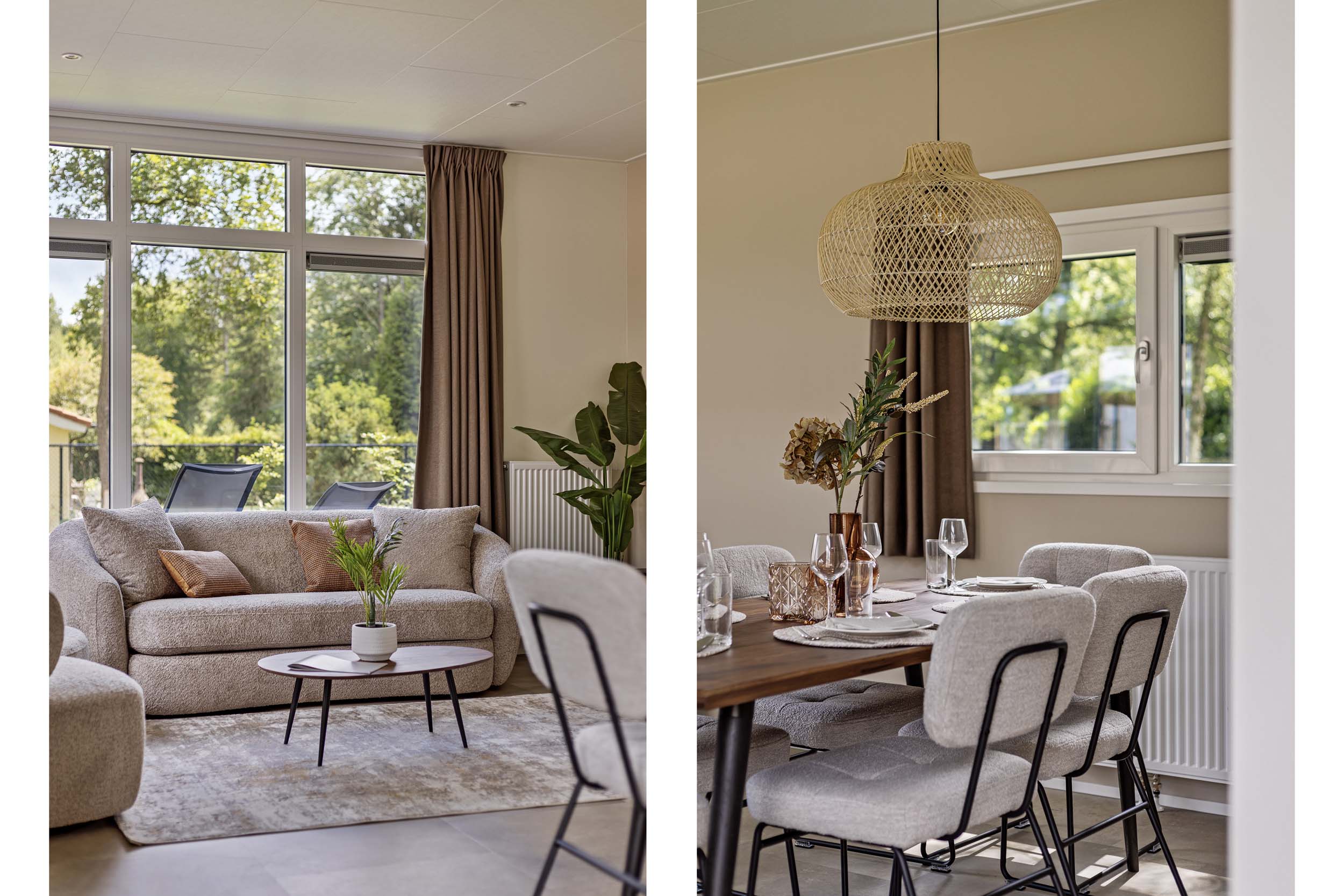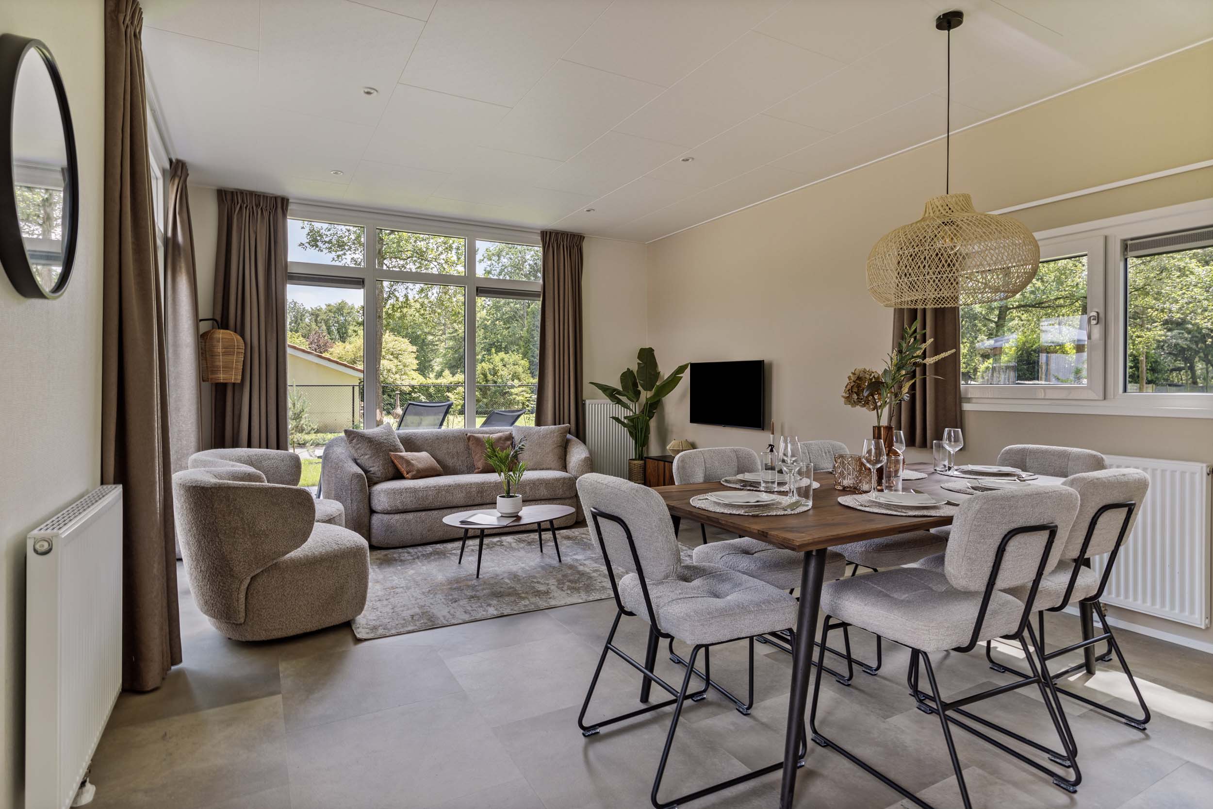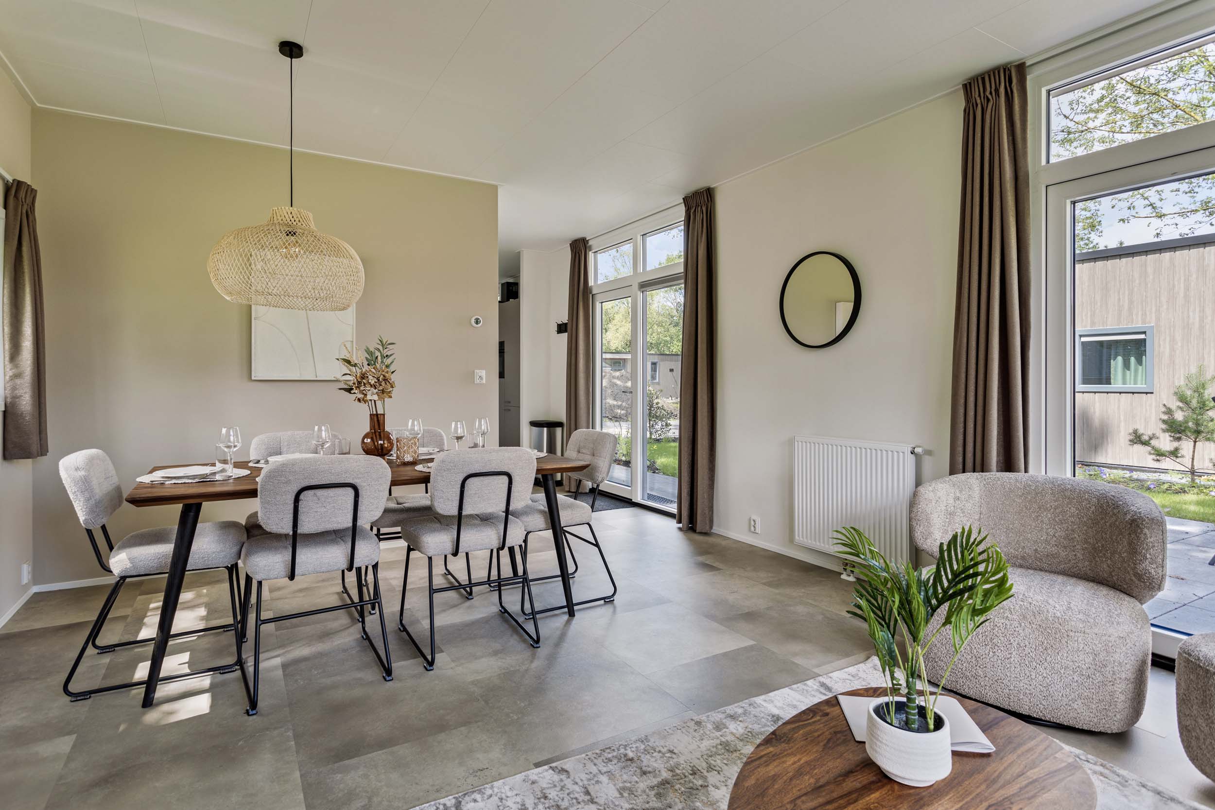 De vakantiewoning heeft een moderne leefruimte met een comfortabel eetgedeelte. De keuken is van alle gemakken voorzien, die men van thuis gewend is. De vele ramen en openslaande deuren zorgen daarbij voor een fijn uitzicht op de omgeving.