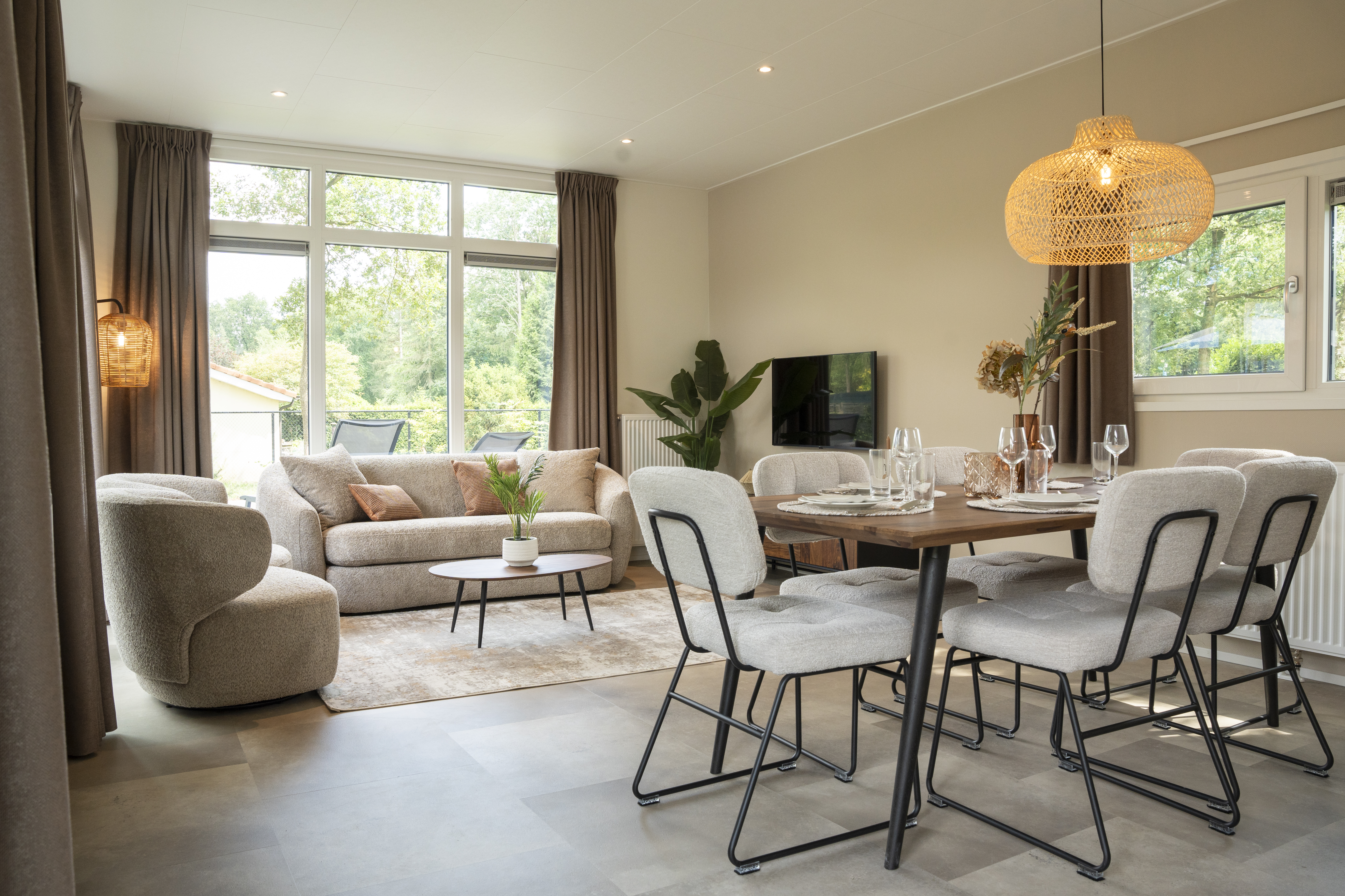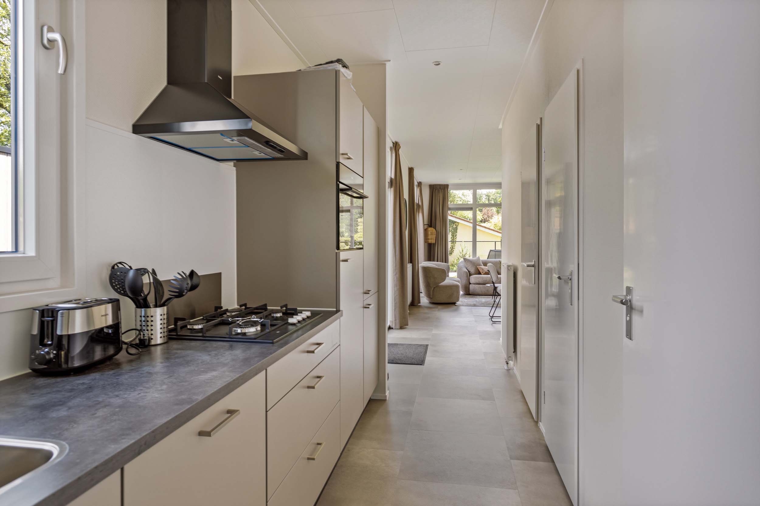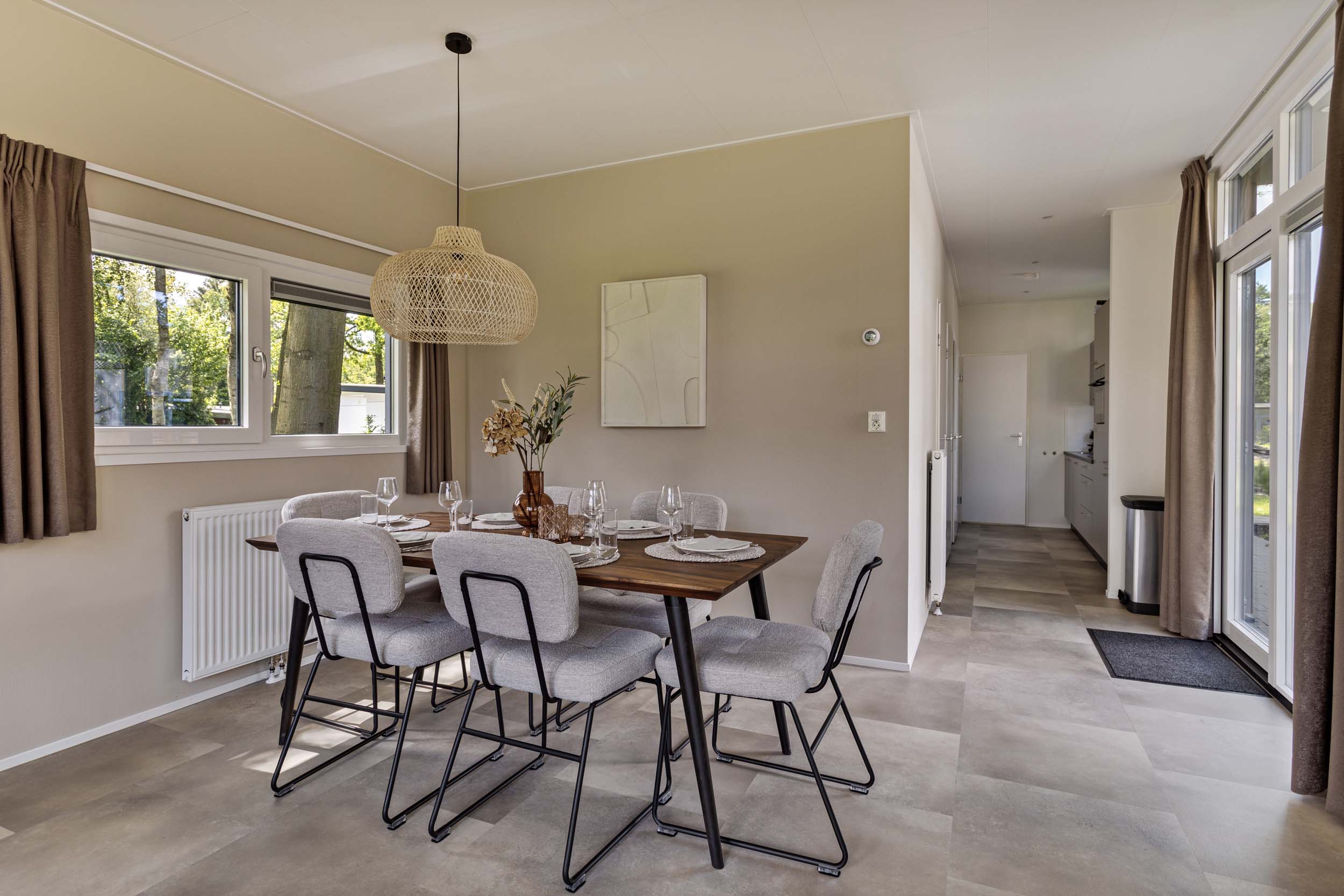 De vakantiewoning heeft een moderne leefruimte met een comfortabel eetgedeelte. De keuken is van alle gemakken voorzien, die men van thuis gewend is. De vele ramen en openslaande deuren zorgen daarbij voor een fijn uitzicht op de omgeving.