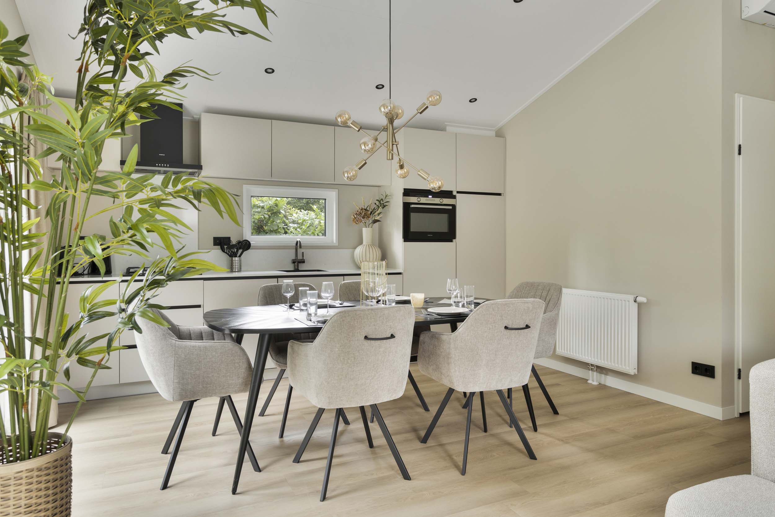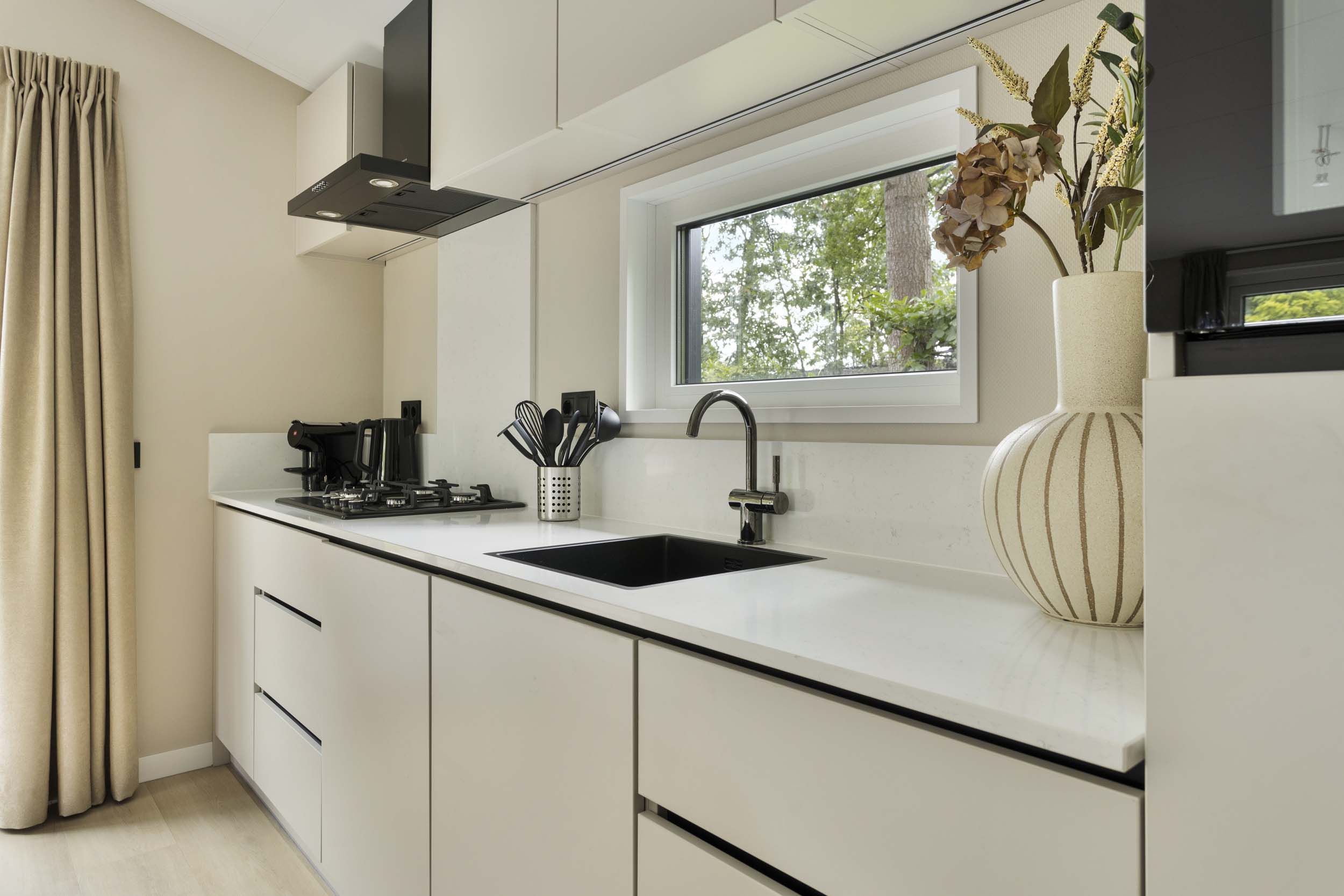 Deze sfeervol ingerichte vakantiewoning beschikt over een ruim leefgedeelte met woonkamer, eethoek en compleet uitgeruste keuken. Door de vele, hoge ramen, worden binnen en buiten harmonieus samengebracht.