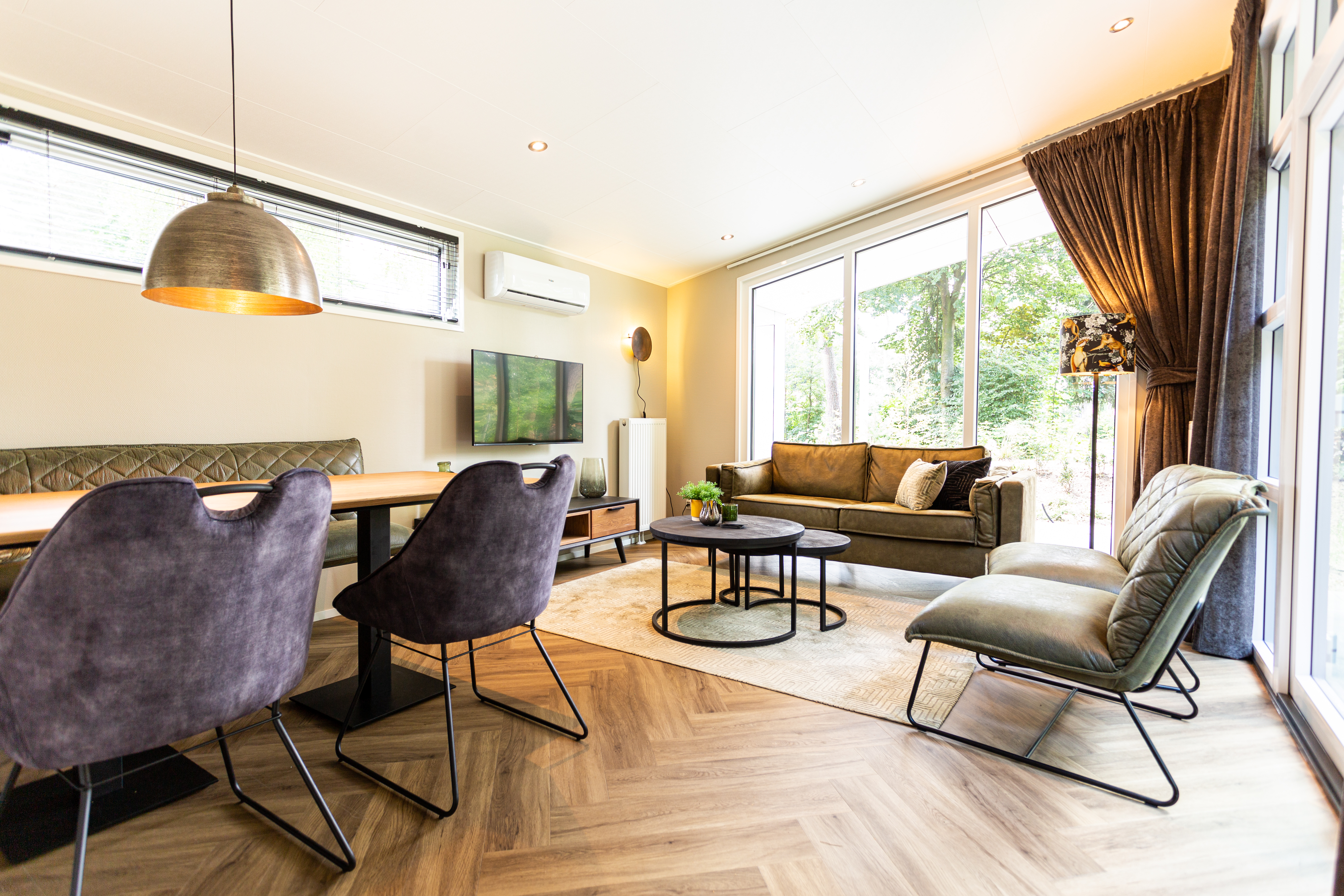 De woonkamer, eethoek en keuken van de Boslodge Silva stralen warmte, sfeer en comfort uit. Dit maakt het een fijne plek om te verblijven en blijvende vakantieherinneringen te maken. Door de vele ramen wordt de woning feilloos verbonden met de natuurrijke omgeving. Het schuine dak geeft de woning daarbij een unieke uitstraling, zowel van buiten, als van binnen bekeken.